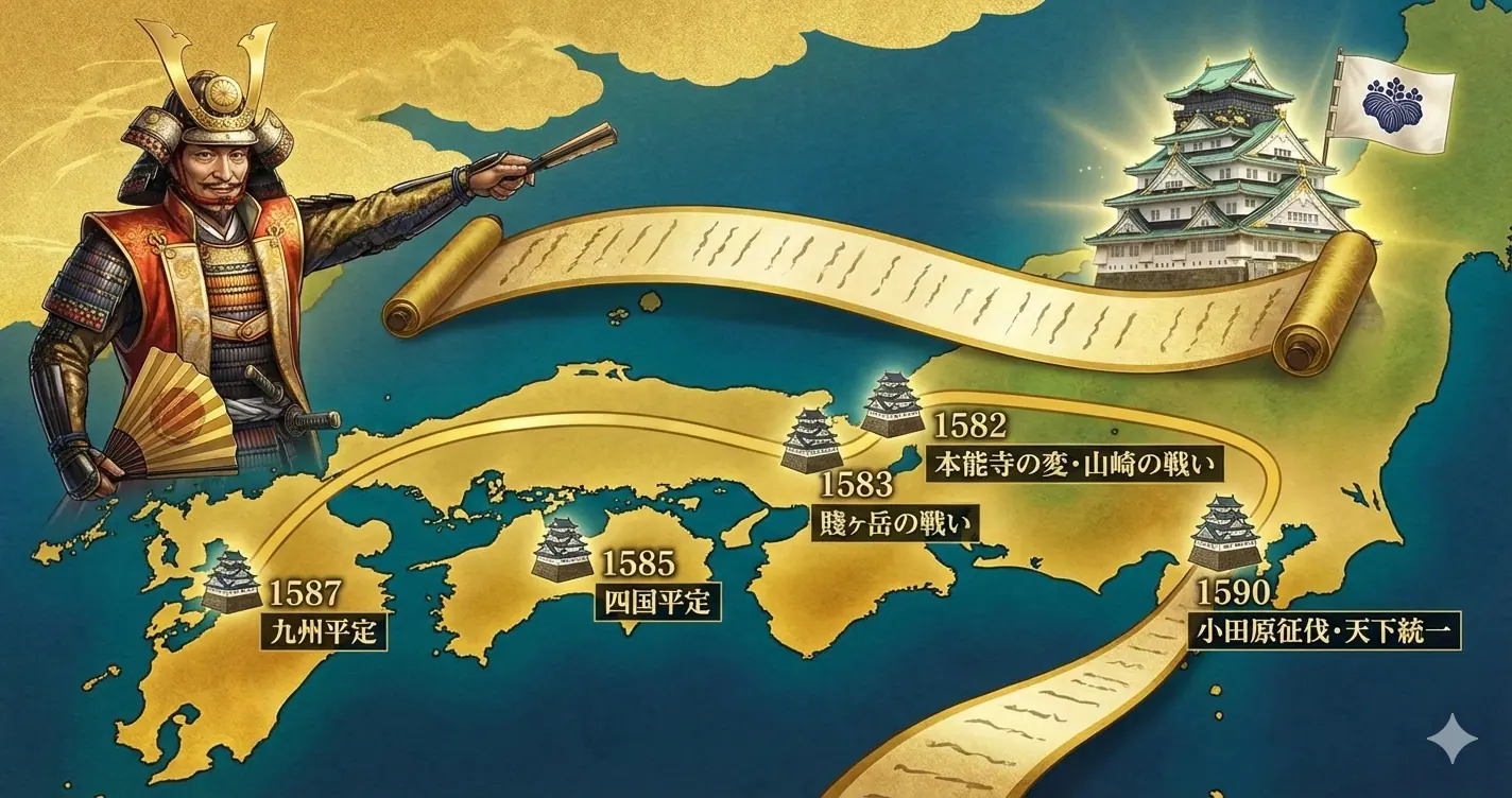 2026年の大河ドラマ「豊臣兄弟」の主人公、豊臣秀吉。 彼は「戦国一の出世頭」と言われますが、その本当の凄さは「スピード」にあります。 実は、主君・織田信長が本能寺で討たれてから、秀吉が最後の敵・北条氏を倒して天下統一を果たすまでの期間は、わずか8年しかありません。